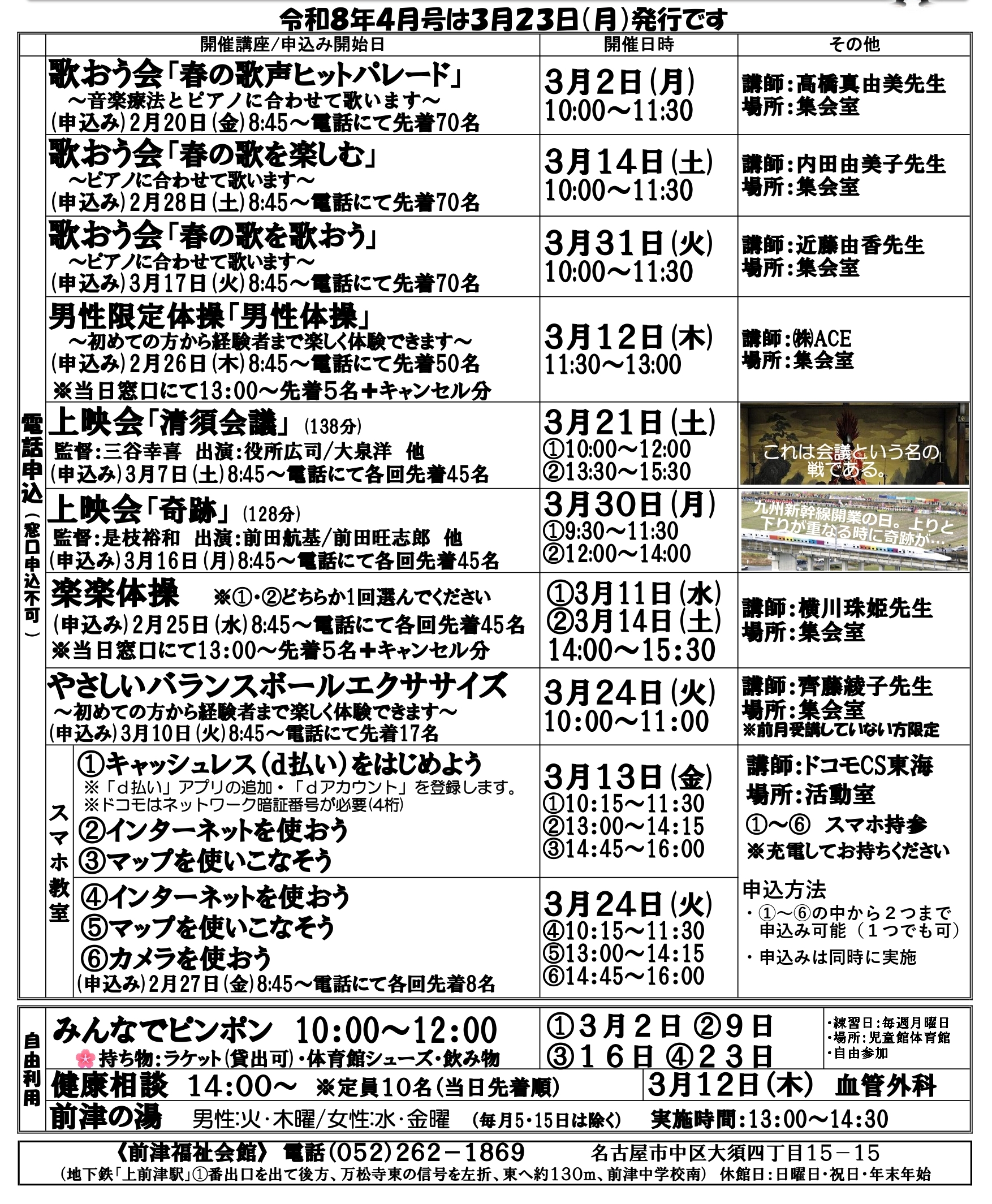 趣味の講座とは別の単発の講座です。自由参加のものと、申し込みが必要なものがあります。「前津福祉会館だより2026年3月号」でお知らせします。